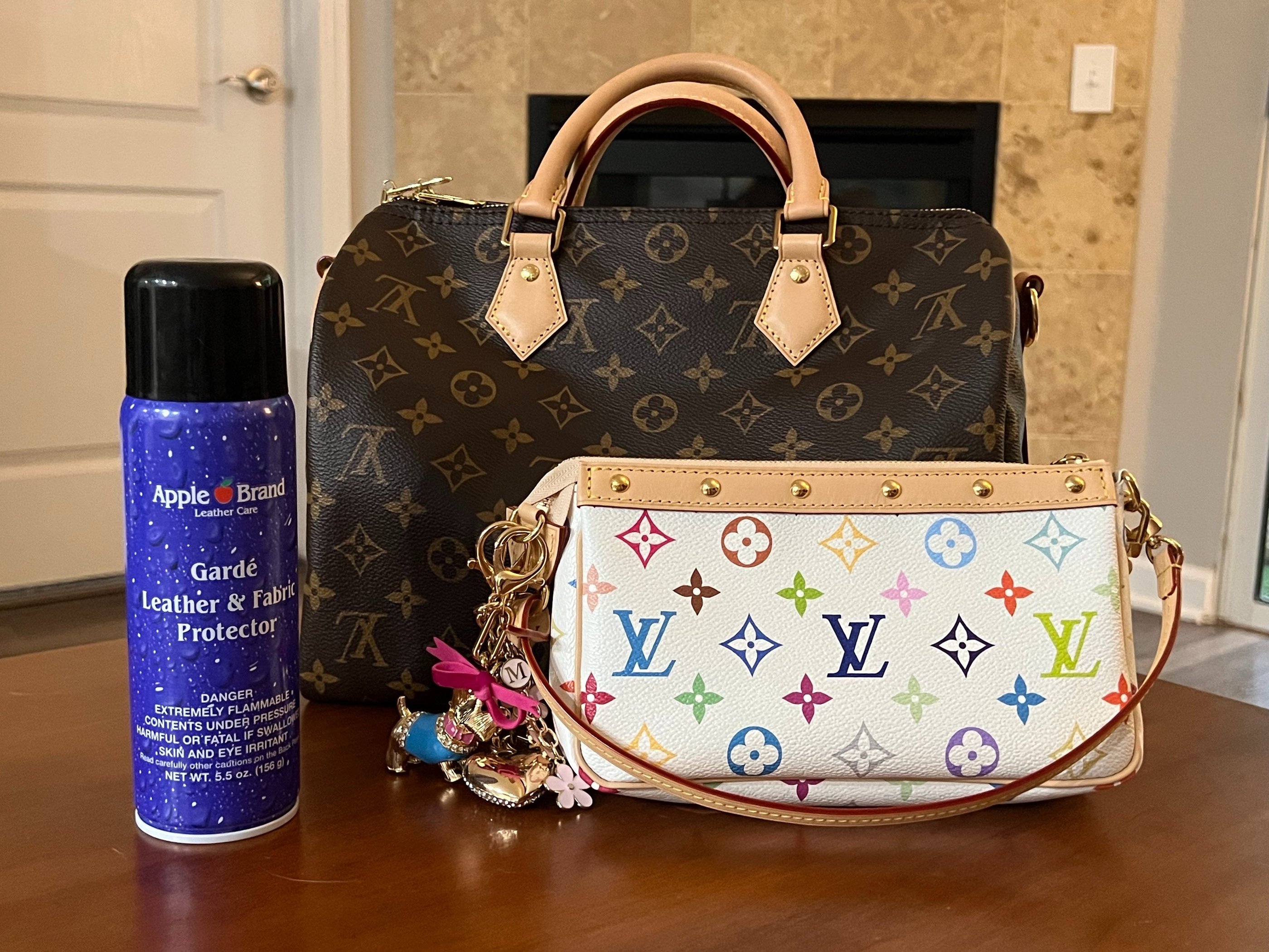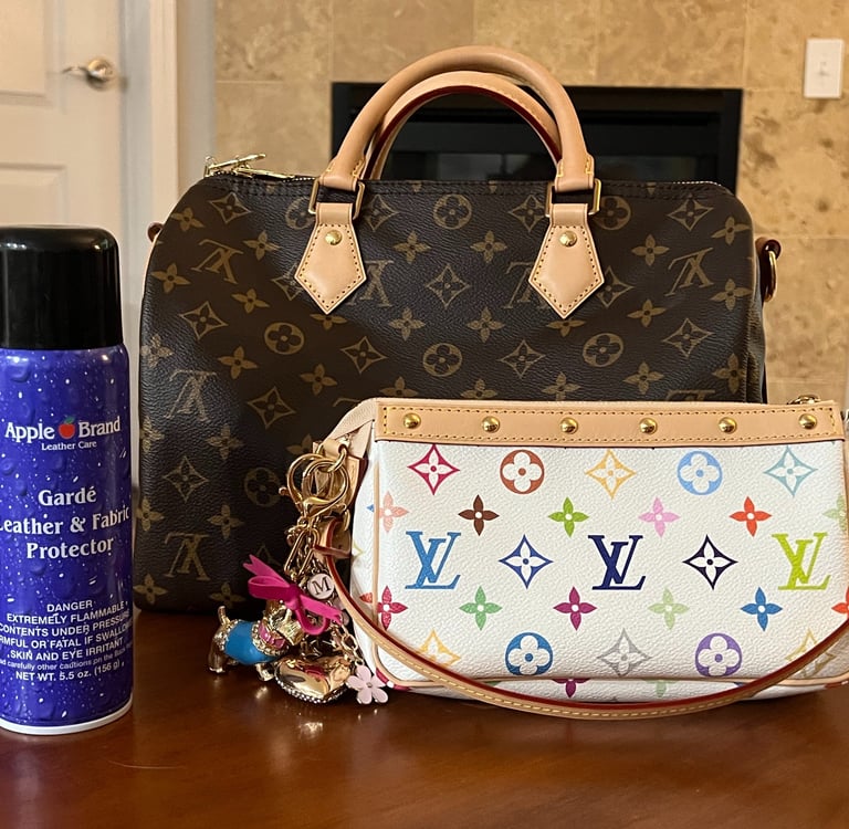 So how exactly do you treat your Vachetta with Apple Guard? Some people like to only treat the Vachetta, but not the canvas, while others prefer to just treat the whole bag. If you prefer to not treat the canvas, you can use a towel to cover it while you spray your Vachetta. Some people also recommend covering metal parts with a towel or even tape. I personally decided to not spray the canvas of my Speedy 30 Monogram, because the canvas is dark and less likely to color transfer. However, I decided to spray the canvas of my white Multicolor Pouchette Accessoires, since I have heard other people mention that the white canvas can be somewhat delicate and take on stains too!