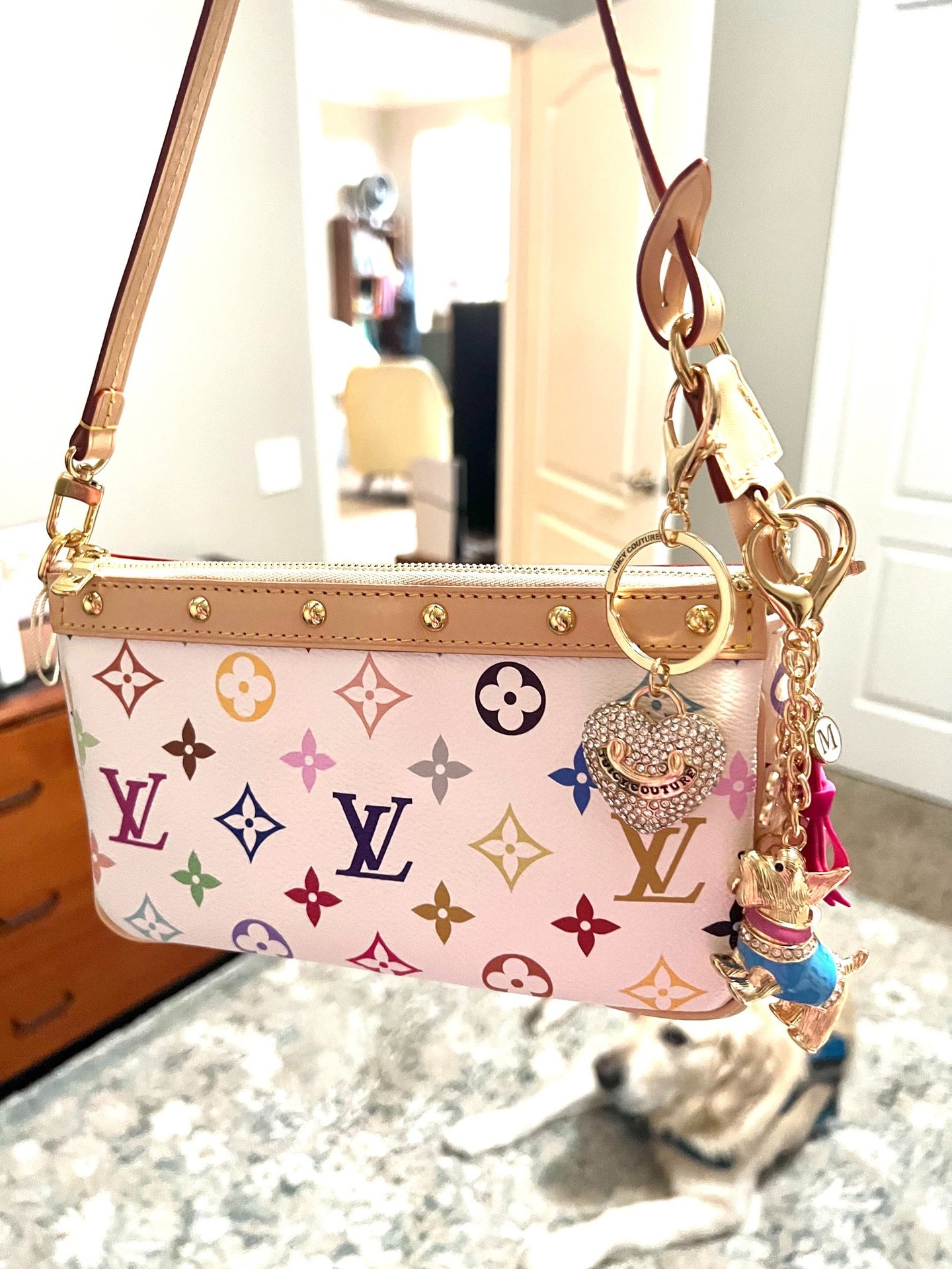 There she is - my pride and joy, the Pouchette Accessoires! All decorated with Juicy Couture charms of course! And my totally unimpressed Golden Retriever in the background